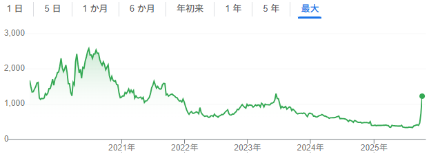 流通株式比率35%でプライム上場維持基準を満たすためには「256億円」の時価総額が必要ですが、本日(2025/10/14)時点の時価総額は「173億円」となっています。上場維持するためには、ここからさらに1.5倍近くの株価上昇が必要となります。