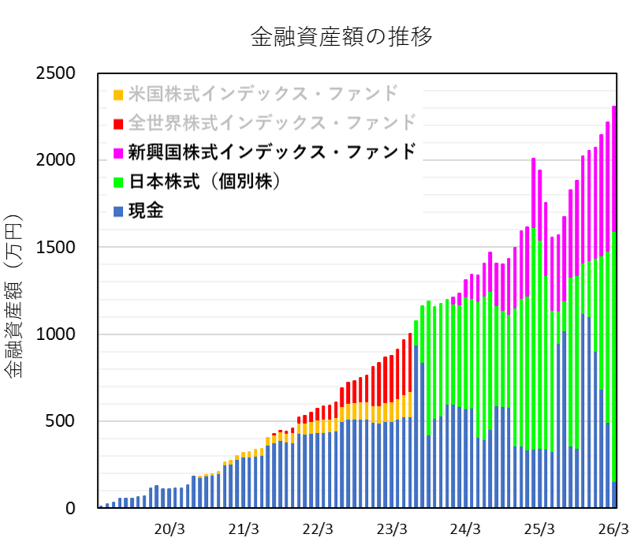 現在は、「新興国株式インデックス・ファンド」、「日本株式(個別株)」、「現金」の3軸で資産形成を行っています。